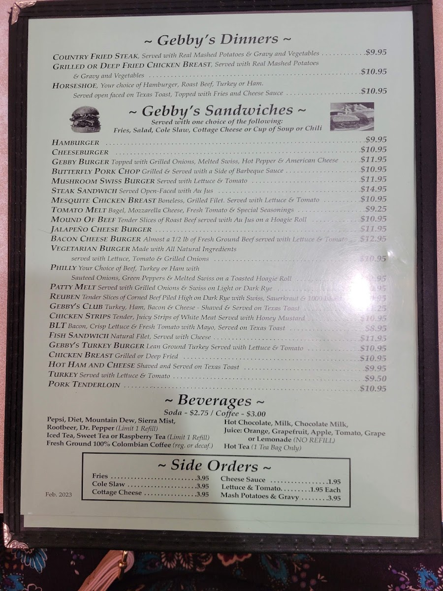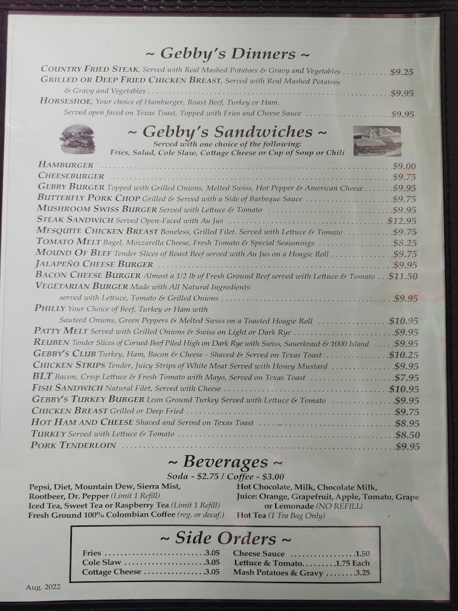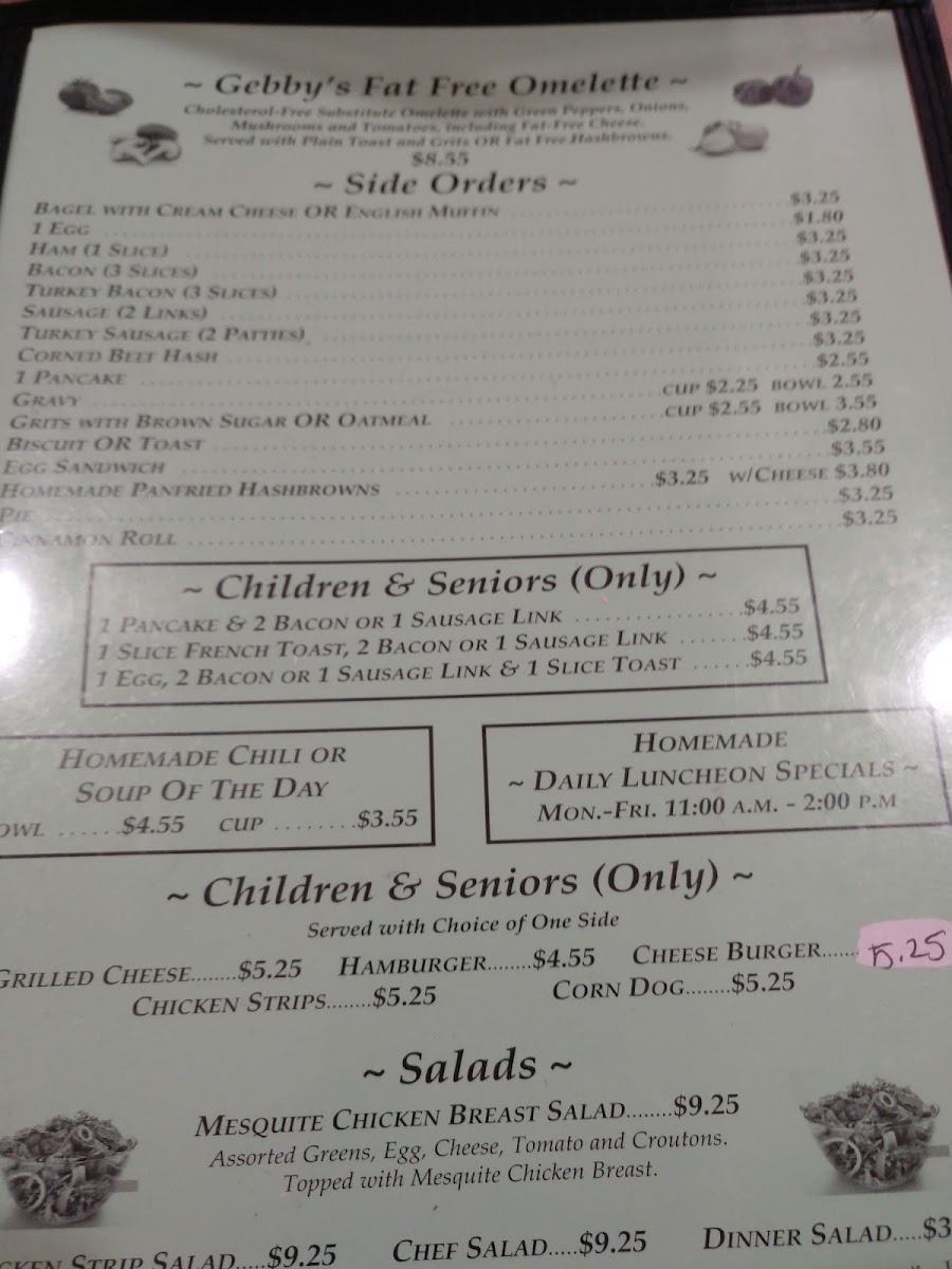 Choose a side: Fries, Salad, Cottage Cheese, Cup of Soup, Chili.