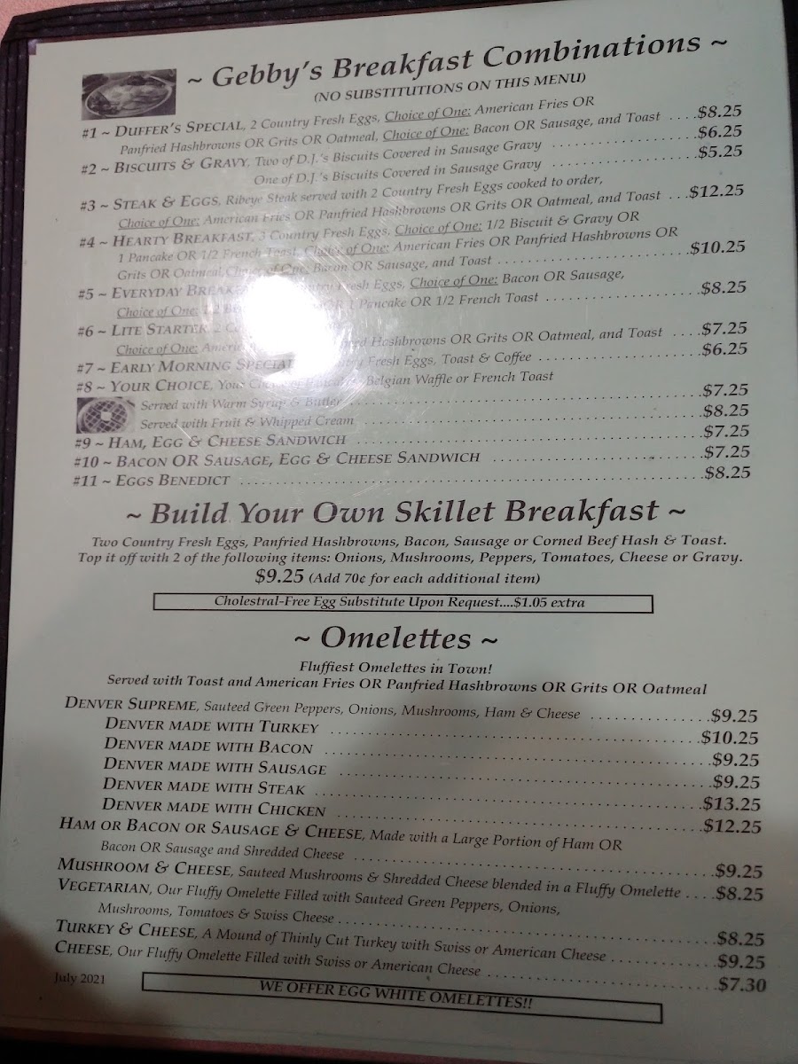 Two country fresh eggs, pan-fried hash browns, bacon, sausage or corn beef hash and toast. Top with two of the following items: onions, mushrooms, tomatoes, cheese or gravy. Choose a style: two country fress eggs, pan fried hashbrown, bacon, sausage, corn beef. Choose a two tops: onions, mushrooms, peppers, tomatoes, cheese.